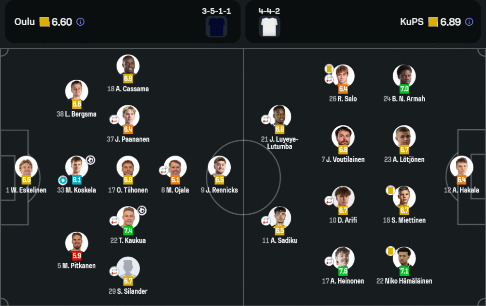 มีก้า คอสเคล่า ของเอซี โอลู รับตำแหน่งผู้เล่นยอดเยี่ยมหลังทำผลงานสุดแกร่งในเกมรับและยังยิงประตูสำคัญตีเสมอให้ทีมได้ คะแนนสูงถึง 8.1 เป็นหัวใจของทีมในเกมนี้อย่างแท้จริง