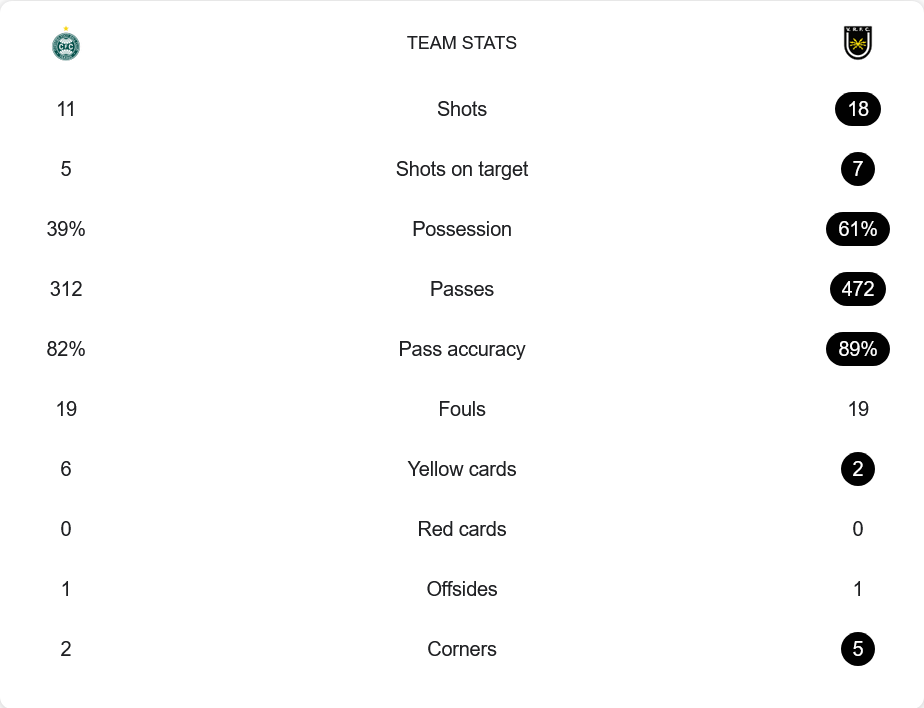 แม้กอริติบ้าจะมีเปอร์เซ็นต์ครองบอลแค่ 39% และจ่ายบอลเพียง 312 ครั้ง แต่พวกเขายิงตรงกรอบ 5 ครั้งและเปลี่ยนเป็นสองประตูได้สำเร็จ โวลตา เรดอนดาครองบอลมากกว่า 61% จ่ายบอลแม่นถึง 89% ยิงมากกว่า 18 ครั้งแต่เจาะไม่เข้า ความดุดันของเกมสะท้อนจากจำนวนฟาวล์ที่เท่ากัน 19 ครั้งต่อฝั่ง และใบเหลือง 6 ต่อ 2 ใบ