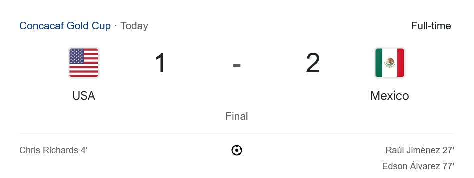 ชัยชนะนัดนี้ทำให้เม็กซิโกคว้าแชมป์คอนคาเคฟโกลด์คัพในปีนี้ไปครองอย่างสมศักดิ์ศรี เก็บสถิติชนะรวดในรอบน็อกเอาต์ 3 นัดติดต่อกัน ขณะที่สหรัฐฯหยุดอยู่เพียงรองแชมป์หลังฟอร์มแรงในรอบก่อนหน้านี้