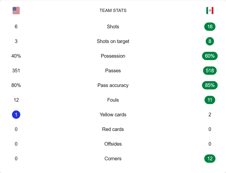 เกมนี้เม็กซิโกเหนือกว่าสหรัฐฯในทุกมิติ พวกเขาครองบอลถึง 60% จ่ายบอลแม่นยำกว่า 85% เมื่อเทียบกับ 80% ของสหรัฐฯ ยิงมากถึง 16 ครั้ง ตรงกรอบ 8 ครั้ง ขณะที่สหรัฐฯได้เพียง 6 ครั้ง ตรงกรอบแค่ 3 สหรัฐฯแทบไม่มีโอกาสจากลูกเซ็ตพีซเพราะไม่ได้เตะมุมเลย ในขณะที่เม็กซิโกได้ไปถึง 12 ลูก