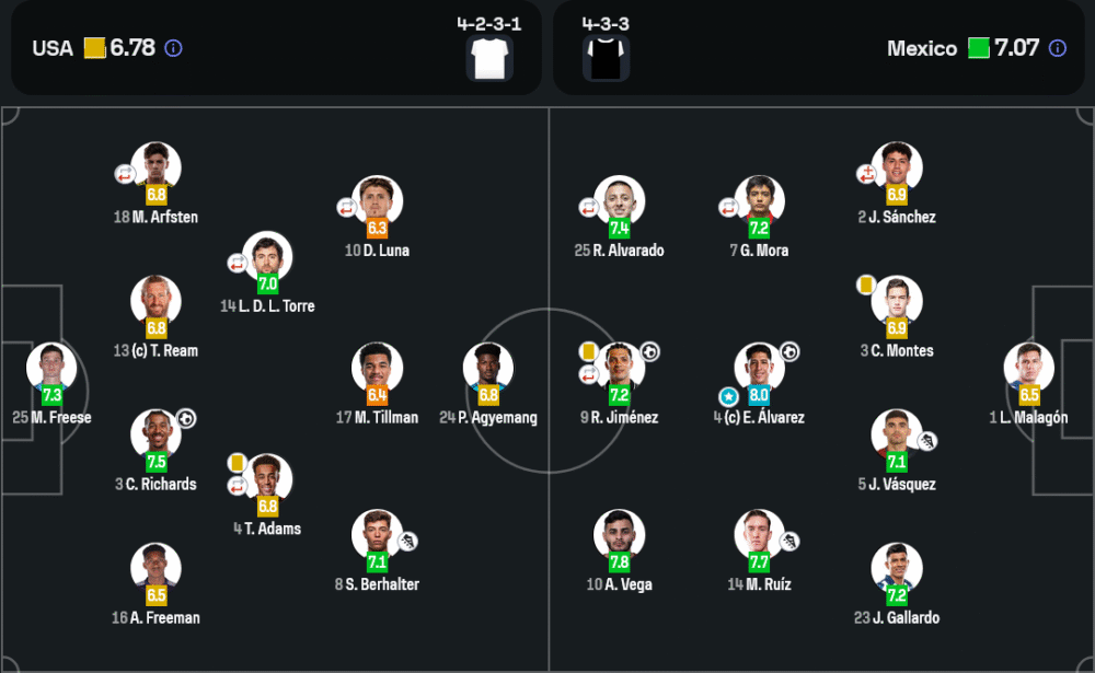 เกมนี้สหรัฐอเมริกาในระบบ 4-2-3-1 เริ่มได้คมโดยอาศัยการโยนเข้ามาของแบ็กข้างและความขยันของตัวรุกสองข้าง แต่ปัญหาคือหลังได้ประตูนำ เกมกลางสนามถูกบดบังด้วยความขยันของแผงกลางเม็กซิโก เม็กซิโกในระบบ 4-3-3 เด่นที่ครองบอลเหนียวแน่น 60% และบุกกดดันจากด้านกว้างอยู่ตลอด จังหวะสวนกลับเร็วก็สร้างโอกาสได้ดี การรับของสหรัฐฯมีปัญหาตรงแบ็กขวา ขณะที่เม็กซิโกมีวินัยเกมรับสูง แม้ถูกยิงนำเร็วแต่ยังคงรูปแบบเกมได้ดีกว่าอย่างเห็นได้ชัด วิเคราะห์บอล แล้วเป็นชัยชนะที่มาจากแท็กติกอันเหนือชั้นและความแน่นอนในเกมรุกของเม็กซิโก