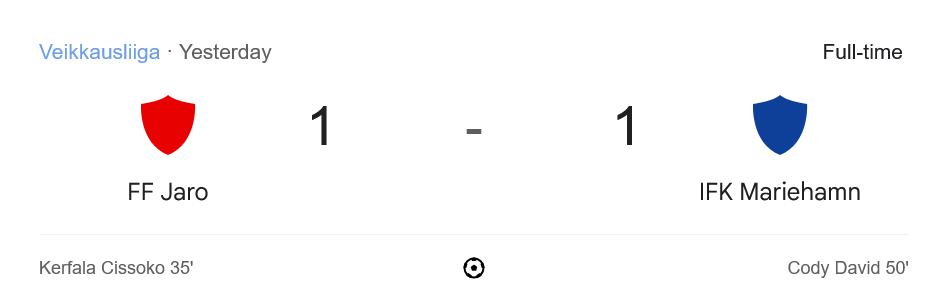 บ้านกีฬา รายงาน ผลบอลสด จากศึกไวเคาส์ลีกาเมื่อคืนที่ผ่านมา FF ยาโร เปิดบ้านเสมอแบบสุดมันกับ IFK มารีฮามน์ 1-1 ในเกมที่แฟนๆ บ้านผลบอล ได้ลุ้นกันตลอด 90 นาทีเต็ม ครึ่งแรกเจ้าถิ่นเป็นฝ่ายครองเกมและได้ประตูขึ้นนำจากลูกยิงของเคอร์ฟาล่า ซิสโซโก้ นาทีที่ 35 ก่อนไปพักครึ่งด้วยสกอร์ 1-0