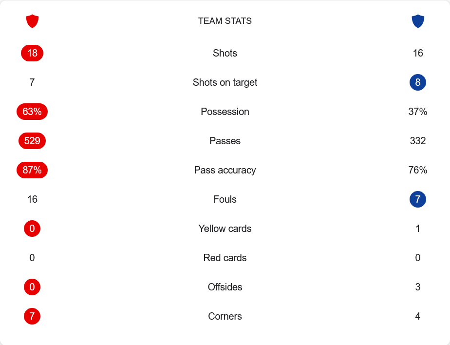 เกมนี้ยาโรครองบอลได้มากถึง 63% จ่ายบอลแม่นยำ 87% เมื่อเทียบกับมารีฮามน์ที่ได้เพียง 37% และจ่ายบอลแม่น 76% อย่างไรก็ตามมารีฮามน์ยิงตรงกรอบมากกว่าเล็กน้อยที่ 8 ครั้งเทียบกับ 7 ของยาโร โอกาสยิงทั้งหมดใกล้เคียงกันที่ 18 ต่อ 16 แต่ฟาวล์ของยาโรเยอะกว่าเกือบเท่าตัว