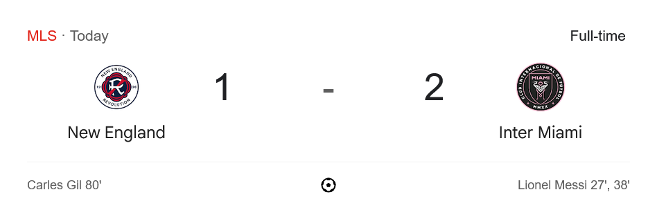เกมเมเจอร์ลีกซอกเกอร์คู่เดือดเมื่อคืนที่ผ่านมา บ้านกีฬา พามาเกาะติด ผลบอลสด จากสนาม นิว อิงแลนด์ เรโวลูชั่น เปิดบ้านรับการมาเยือนของ อินเตอร์ ไมอามี่ ที่ขนดาวดังอย่าง ลิโอเนล เมสซี่ ลงบัญชาเกม และก็ไม่ทำให้แฟนบอลผิดหวัง เมื่อซัดคนเดียวสองประตูพาทีมบุกเชือด 2-1 อย่างเข้มข้น