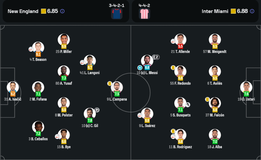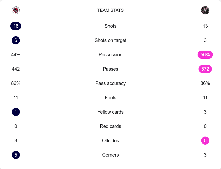 ตลอด 90 นาที อินเตอร์ ไมอามี่ ครองบอล 56% เหนือกว่าเจ้าบ้านที่ครองได้เพียง 44% ยิงทั้งหมด 13 ครั้ง เข้ากรอบ 3 ครั้ง ขณะที่ นิว อิงแลนด์ ยิงมากกว่า 16 ครั้ง เข้ากรอบ 6 ครั้ง แต่จังหวะจบสกอร์ยังไม่เฉียบขาด ไมอามี่ต่อบอลแม่นกว่า 572 ต่อ 442 ครั้ง และทั้งสองทีมฟาวล์เท่ากันที่ 11 ครั้ง