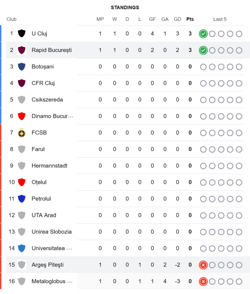 ราปิด บูคาเรสต์เก็บ 3 แต้มแรกได้อย่างมั่นใจขึ้นมาอยู่อันดับ 2 ของตาราง ตามหลัง ยู คลูจ์ ที่ประตูได้เสียดีกว่า ขณะที่อาร์เจส ปีเตสติ แพ้นัดแรกหล่นไปอยู่โซนล่างรั้งอันดับ 15 ของตาราง