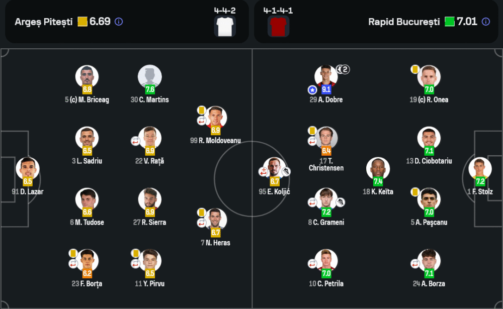 ครึ่งแรก ราปิด บูคาเรสต์ ไม่รอช้า เดินหน้าเพรสซิ่งและบุกใส่ทันที ก่อนที่แค่ 3 นาทีแรกจะได้ประตูขึ้นนำจาก อเล็กซ์ โดเบร ที่สอดเข้ายิงอย่างเด็ดขาด และยังไม่พอ นาที 34 โดเบร คนเดิมกดประตูที่สองให้ทีมเยือนหนีเป็น 2-0 ทำเอาเกมของอาร์เจส ปีเตสติดับสนิท จบครึ่งแรก ราปิดครองความได้เปรียบแบบชัดเจน