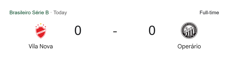 ศึกฟุตบอล คัมปิโอนาโต บราซิเลียโร ซีรีบี เมื่อเช้านี้ตามเวลาไทย วิลา โนวา เปิดรังต้อนรับการมาเยือนของ โอเปราริโอ แฟร์โรวิอาริโอ พีอาร์ ก่อนจบลงด้วยผลเสมอแบบไร้สกอร์ 0-0 ท่ามกลางเกมที่ทั้งสองทีมบุกแลกกันตลอด 90 นาที บ้านกีฬา เกาะติดรายงาน ผลบอลสด ให้แฟนบอลได้ลุ้นแบบชิดขอบสนาม แม้สกอร์จะไม่ขยับแต่ความดุเดือดยังคงเต็มพิกัด
