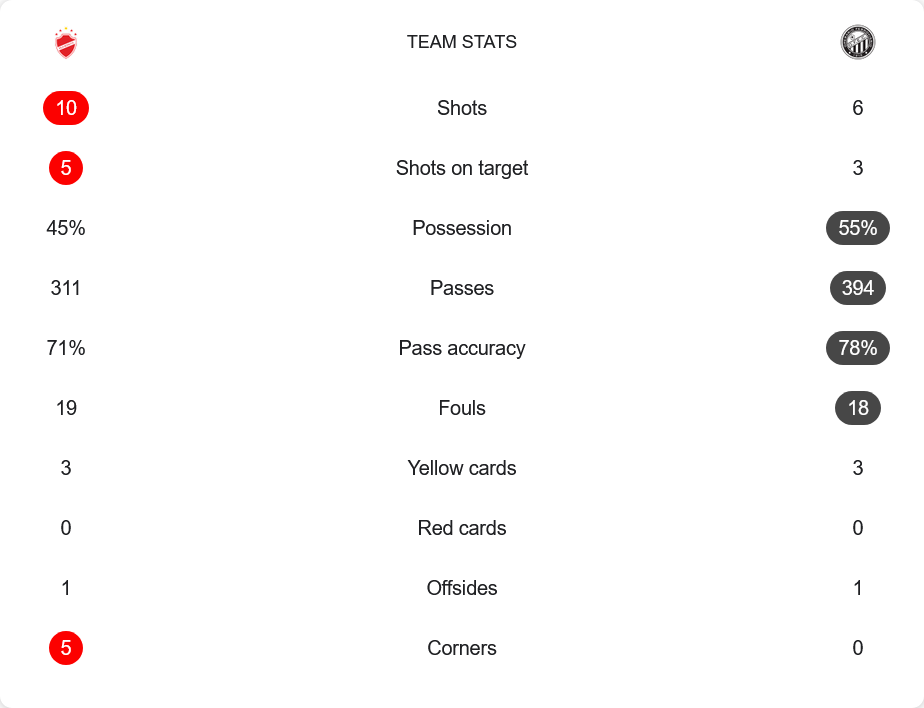 เกมนี้เต็มไปด้วยตัวเลขที่สะท้อนถึงความสูสี วิลา โนวา มีโอกาสยิงรวม 10 ครั้ง เข้ากรอบ 5 ครั้ง ครองบอล 45% จ่ายบอลสำเร็จ 311 ครั้งที่ความแม่นยำ 71% ฟาวล์ 19 ครั้ง และได้เตะมุม 5 ครั้ง ส่วนโอเปราริโอยิงรวม 6 ครั้ง เข้ากรอบ 3 ครั้ง ครองบอล 55% จ่ายบอลสำเร็จ 394 ครั้งที่ความแม่นยำ 78% ฟาวล์ 18 ครั้ง และได้เตะมุม 0 ครั้ง