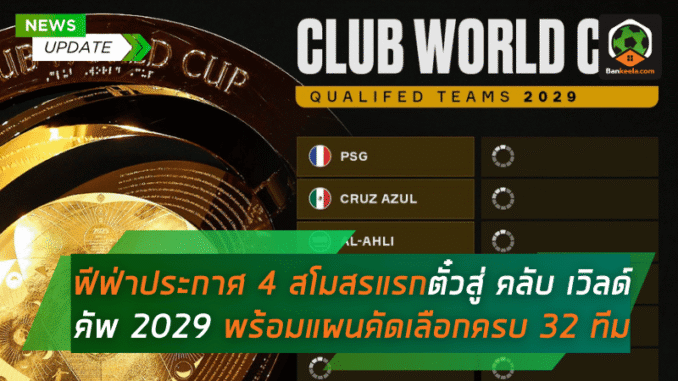 ศึกใหญ่ที่สุดของสโมสรโลกกำลังเดินหน้าอย่างเข้มข้น เมื่อ ฟีฟ่า คลับ เวิลด์ คัพ 2029 ถูกยืนยันแล้วว่าจะมี 32 ทีม ลงชิงชัย และล่าสุด ฟีฟ่าได้ประกาศชื่อ 4 สโมสรแรกที่การันตีสิทธิ์เข้าร่วมรอบสุดท้ายอย่างเป็นทางการ ได้แก่ ปารีส แซงต์-แชร์กแมง, ครูซ อาซูล, พิรามิดส์ และ อัล อาห์ลี พร้อมเปิดเงื่อนไขการคัดเลือกอีก 28 ทีมที่เหลือในรูปแบบสุดโหด เพื่อเฟ้นหาสโมสรแกร่งที่สุดจากทุกทวีปมาฟาดแข้งกันในอีก 4 ปีข้างหน้า
