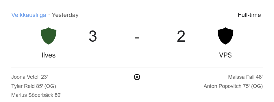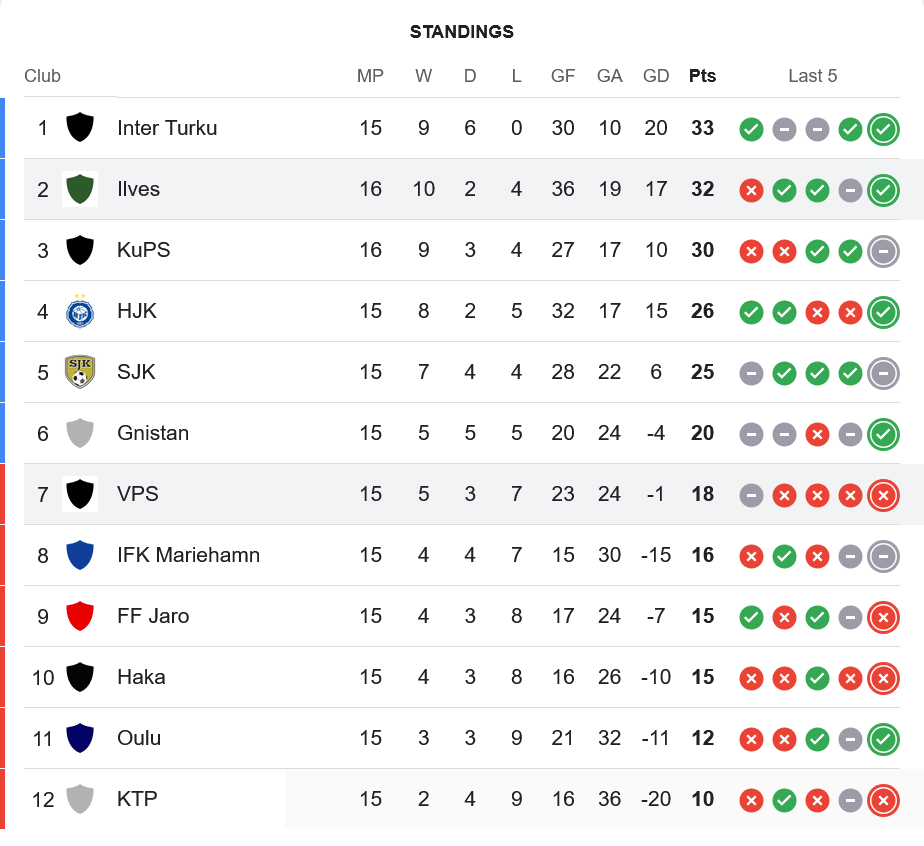 ชัยชนะเกมนี้ส่งอิลเวสขึ้นไปเป็นรองจ่าฝูง มี 32 คะแนนจาก 16 นัด ไล่หลังอินเตอร์ ตูร์คูแค่แต้มเดียว ด้านวีพีเอสยังจมอยู่ที่อันดับ 7 มี 18 แต้ม ห่างโซนท็อปโฟร์มากขึ้น