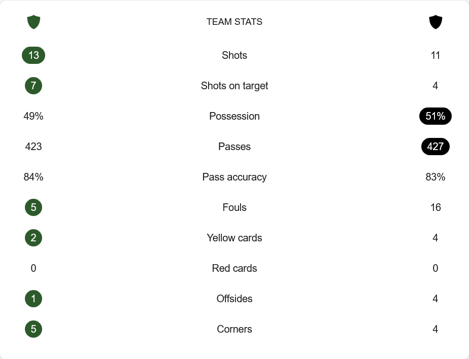 เกมนี้อิลเวสครองบอล 49% เทียบกับวีพีเอส 51% อิลเวสยิงทั้งหมด 13 ครั้งเข้ากรอบ 7 ครั้ง ขณะที่วีพีสยิง 11 ครั้งเข้ากรอบ 4 ครั้ง จำนวนการจ่ายบอลใกล้เคียงกันที่ราว 420-427 ครั้ง อิลเวสฟาวล์น้อยกว่าแค่ 5 ครั้งเทียบกับวีพีเอสที่ฟาวล์ถึง 16 ครั้ง และใบเหลืองของวีพีเอสมากกว่าถึง 4 ใบ