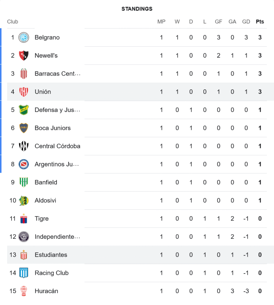หลังจบเกม ยูเนี่ยน ซานตา เฟ่ ขยับขึ้นไปอยู่อันดับ 4 ของตารางด้วย 3 คะแนนเต็มจากนัดแรก ส่วนเอสตูเดียนเตสยังไม่มีแต้ม รั้งอันดับ 13 ของตาราง ซึ่งทั้งคู่ยังมีเส้นทางอีกยาวไกลในฤดูกาลนี้