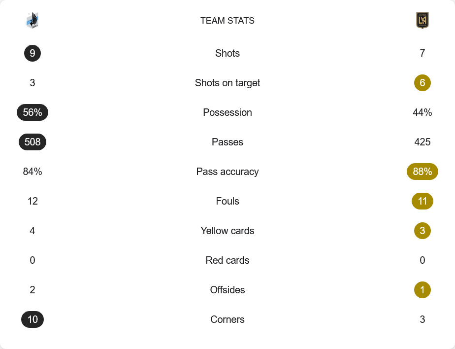 แม้มินนิโซตาจะครองบอลได้มากถึง 56% จ่ายบอลได้ 508 ครั้ง แต่ความแม่นยำยังน้อยกว่าแอลเอ เอฟซีที่แม่นถึง 88% แอลเอยิงเข้ากรอบ 6 ครั้งจากโอกาสทั้งหมด 7 ครั้ง ขณะที่มินนิโซตายิงเข้ากรอบแค่ 3 ครั้งจาก 9 โอกาส มินนิโซตาได้ลูกเตะมุมถึง 10 ครั้งแต่ไม่สามารถเจาะแนวรับทีมเยือนได้เลย