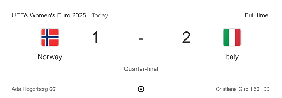 ศึกฟุตบอลหญิงชิงแชมป์แห่งชาติยุโรป 2025 รอบก่อนรองชนะเลิศ คู่บิ๊กแมตช์เมื่อคืนนี้ อิตาลีหญิงโชว์ฟอร์มแกร่งเด็ดขาด เฉือนเอาชนะนอร์เวย์หญิงไปแบบระทึกใจ 2-1 โดย บ้านกีฬา เกาะติด ผลบอลสด แบบวินาทีต่อวินาทีมาเล่าให้ทุกคนได้ลุ้นตามกันอย่างดุดัน