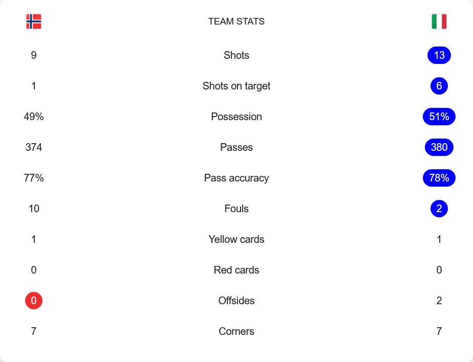แม้นอร์เวย์จะมีโอกาสยิงถึง 9 ครั้ง แต่เข้ากรอบแค่ 1 ขณะที่อิตาลีเหนียวแน่นและแม่นยำกว่ามีโอกาสยิง 13 เข้ากรอบถึง 6 ครองบอลใกล้เคียงกัน นอร์เวย์ 49% อิตาลี 51% แต่ความแม่นยำจ่ายบอลของอิตาลีที่ 78% เหนือกว่าเล็กน้อย ทำให้เกมโดยรวมดูเหนือกว่าเล็กน้อย