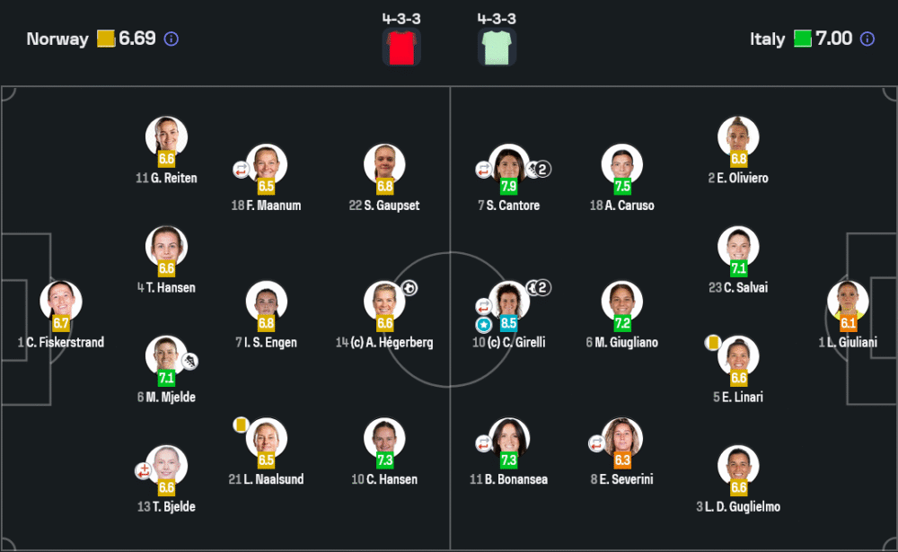 เกมนี้นอร์เวย์มาในแผน 4-3-3 วาง เฮเกอร์เบิร์ก คุมเกมกลางพร้อมให้ตัวรุกสองฝั่งทำงานหนัก ใช้การโยนและความแข็งแกร่งเข้าปะทะ ส่วนอิตาลีเน้น วิเคราะห์บอล แบบละเอียด จัด 4-3-3 เช่นกัน แต่เน้นต่อบอลสั้นรวดเร็ว ใช้คันโตเร่และโบนันเซียฉีกแนวรับคู่แข่ง ก่อนให้จิเรลลี่ปิดสกอร์ ความต่างอยู่ที่ความคม อิตาลีรุกได้เป็นระบบกว่าและรับเหนียวแน่นจนคว้าชัยไปได้