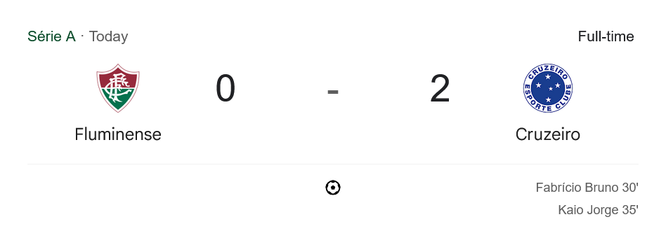 ครึ่งแรก ฟลูมิเนนเซอาร์เจเดินเกมรุกดุเดือด ครองบอลถึง 70% สร้างโอกาสยิงกว่า 15 ครั้ง แต่จังหวะสุดท้ายยังไม่ผ่านแผงรับและความเหนียวของคาสซิโอ้ จนแล้วจนรอดนาที 30 ครูไซโร่สวนกลับเร็ว ฟาบริซิโอ้ บรูโน่สอดขึ้นมาโหม่งตุงตาข่ายให้ทีมเยือนนำ 1-0 และอีก 5 นาทีถัดมา คาโย่ จอร์จ ซัดประตูที่สองสุดคม ครึ่งแรกจบที่สกอร์นี้ ครึ่งหลังเจ้าบ้านพยายามลุยหนัก ยิงรวมถึง 28 ครั้งแต่ไม่เข้าเป้า ขณะที่ครูไซโร่ลงไปรับลึกยันสกอร์ สุดท้ายจบเกม ครูไซโร่บุกมาคว้าสามแต้มกลับบ้านสำเร็จ