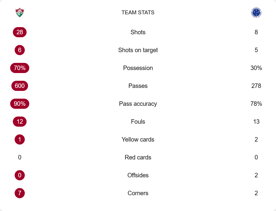 ฟลูมิเนนเซอาร์เจเหนือกว่าทุกด้านทั้งครองบอล 70% ผ่านบอล 600 ครั้ง ยิงรวม 28 ครั้ง เข้ากรอบ 6 ครั้ง แต่ครูไซโร่คมกว่า ยิงแค่ 8 ครั้ง เข้ากรอบ 5 และได้ 2 ประตู เปอร์เซ็นต์จ่ายบอลครูไซโร่ 78% ฟลูมิเนนเซอาร์เจ 90% ฟลูมิเนนเซอาร์เจได้เตะมุม 7 ครั้ง ขณะที่ครูไซโร่มีแค่ 2 ครั้ง