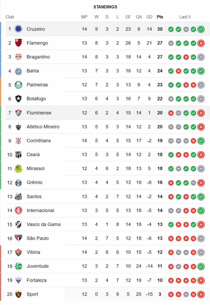 หลังจบเกมนี้ ครูไซโร่ยังรั้งจ่าฝูงเดี่ยวที่ 30 คะแนนจาก 14 นัด นำฟลามิงโก้และบรากันติโน่อยู่ 3 แต้ม ขณะที่ฟลูมิเนนเซอาร์เจยังอยู่ที่ 7 มี 20 แต้ม แต่โดนคู่แข่งโซนบนทิ้งระยะเพิ่ม