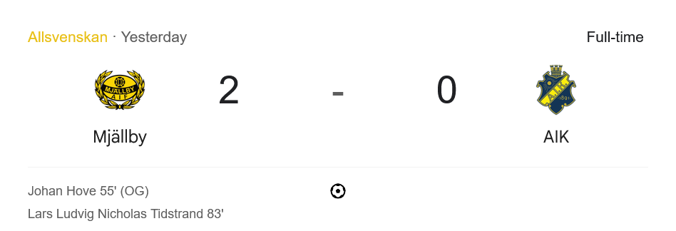 ศึกออลสเวนส์คาน เมื่อคืนที่ผ่านมา มอลล์บี้ เอไอเอฟ ยังคงโชว์ฟอร์มโหดสมราคา ด้วยการเปิดรังถล่มเอไอเค โซลน่า 2-0 บ้านกีฬา เกาะติด ผลบอลสด ตั้งแต่ต้นจนจบ เห็นชัดว่านี่คือทีมลุ้นแชมป์ตัวจริง เสียงเชียร์กระหึ่มสนามเมื่อได้สองประตูในครึ่งหลัง ส่งเอไอเคกลับบ้านมือเปล่า