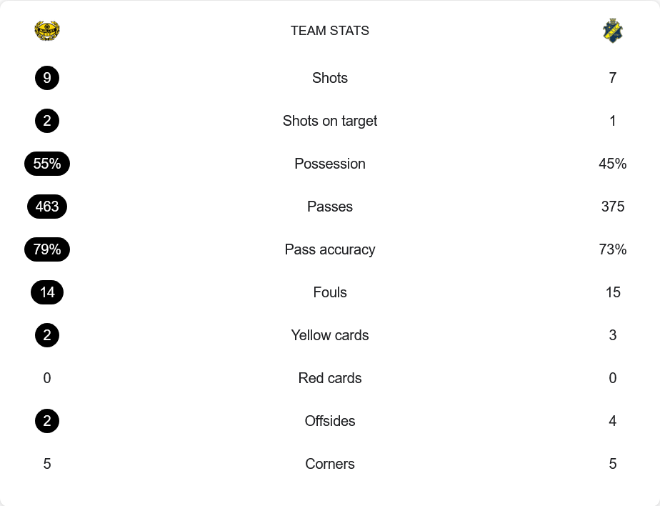 เกมนี้มอลล์บี้เหนือกว่าทั้งการครองบอลและจำนวนจังหวะจบสกอร์ โดยมีโอกาสยิง 9 ครั้ง เข้ากรอบ 2 ขณะที่เอไอเคยิง 7 ครั้งเข้ากรอบเพียง 1 ครั้ง การจ่ายบอลของเจ้าบ้านก็แม่นกว่า 79% เทียบกับ 73% ของทีมเยือน ทั้งยังเล่นเกมเพรสซิ่งได้ดีจนเอไอเคเจอปัญหาตลอด
