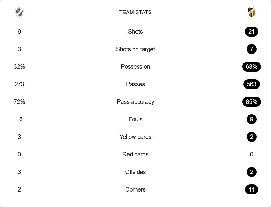 สถิติสะท้อนภาพเกมชัดเจน ฮัคเค่นเหนือกว่าชัดเจนทั้งการครองบอล การจ่ายบอลที่แม่นยำกว่า และโอกาสยิงมากกว่าอย่างท่วมท้น แต่ฮาล์มสตัดยังแสดงให้เห็นถึงเกมรับที่เหนียวแน่น เสียฟาวล์มากกว่าเล็กน้อยแต่ไม่ส่งผลเสียหายร้ายแรง