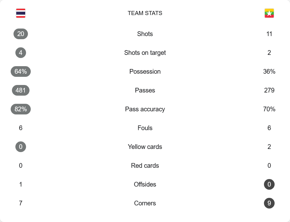 แม้ผลจะเสมอแต่ไทยมีสถิติเหนือกว่าชัดเจน ครองบอลมากถึง 64% ยิงมากถึง 20 ครั้ง เข้ากรอบ 4 ครั้ง และจ่ายบอลสำเร็จถึง 82% เทียบกับเมียนมาร์ที่ครองบอลเพียง 36% ยิง 11 ครั้ง เข้ากรอบแค่ 2 ครั้ง และจ่ายแม่นเพียง 70% ขณะที่เกมรับเมียนมาร์เหนียวแน่นจนช่วยเก็บหนึ่งแต้มมาได้สำเร็จ