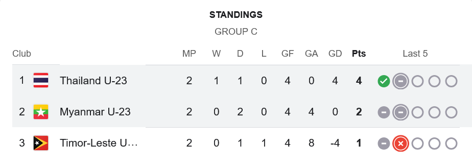 หลังเสมอในเกมนี้ ไทยยู-23 รั้งจ่าฝูงของกลุ่ม C ด้วย 4 แต้มจาก 2 นัด ตามมาด้วยเมียนมาร์ 2 แต้ม และติมอร์เลสเต้ 1 แต้ม ทำให้ไทยยังคงได้ลุ้นผ่านเข้าสู่รอบต่อไป ส่วนเมียนมาร์ต้องเก็บชัยในเกมถัดไปเพื่อหวังเข้ารอบเช่นกัน