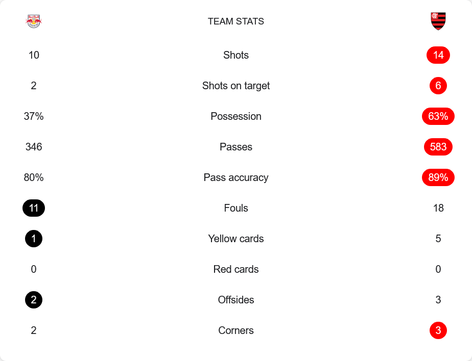 ฟลาเมงโกเหนือกว่าชัดเจนในหลายมิติ เริ่มจากการครองบอล 63% ต่อ 37% จ่ายบอล 583 ครั้งด้วยความแม่นยำถึง 89% เทียบกับเจ้าบ้านที่ทำได้ 346 ครั้งและแม่นยำ 80% ฟลาเมงโกยิงทั้งหมด 14 ครั้ง เข้ากรอบ 6 ขณะที่บรากันติโน้ยิง 10 ครั้งแต่ตรงกรอบเพียง 2 นอกจากนี้ ฟลาเมงโกยังได้เตะมุม 3 ครั้ง และโดนใบเหลืองถึง 5 ใบ บ่งบอกถึงความดุดันในเกมรับเช่นกัน