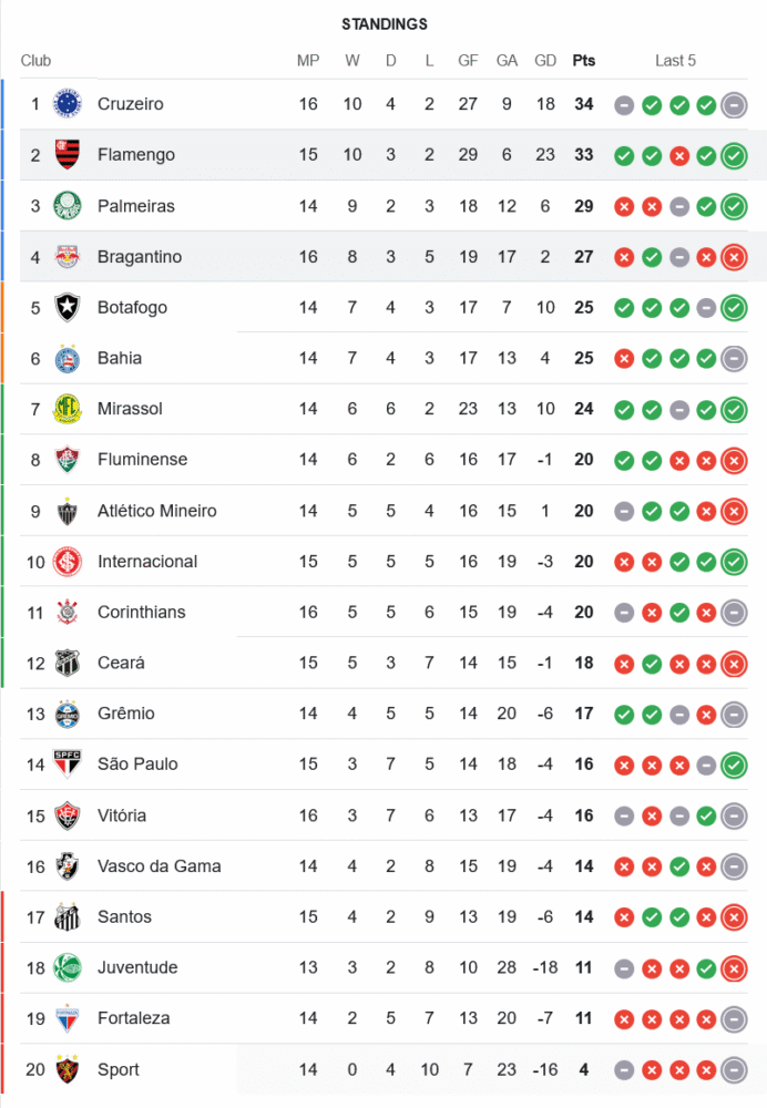หลังเกมนี้ ฟลาเมงโก เก็บเพิ่มเป็น 33 แต้มจาก 15 นัด ขยับขึ้นรองจ่าฝูงตามหลังจ่าฝูงครูไซโร่เพียงแต้มเดียว ส่วน บรากันติโน้ พลาดโอกาสทองที่จะตีตั๋วเข้าท็อปทรี ยังคงรั้งอันดับ 4 มี 27 แต้มจาก 16 นัด และโดนทีมไล่หลังจี้มาติดๆ
