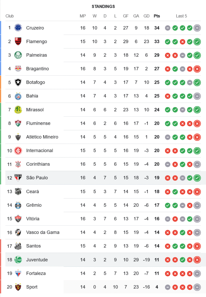 ชัยชนะนัดนี้ส่งผลให้ เซาเปาโล ขยับขึ้นมาอยู่อันดับ 12 ของตารางด้วยคะแนน 19 แต้มจาก 16 นัด ห่างจากโซนตกชั้นพอสมควรและเริ่มเห็นแสงแห่งความหวังหลังเก็บชัย 2 นัดติด ส่วน ยูเวนตูเด้ ยังคงจมอยู่โซนสีแดงที่อันดับ 18 มีเพียง 11 แต้มจาก 14 เกม และต้องเร่งเก็บแต้มโดยด่วนหากไม่อยากร่วงกลับลีกล่างในฤดูกาลหน้า