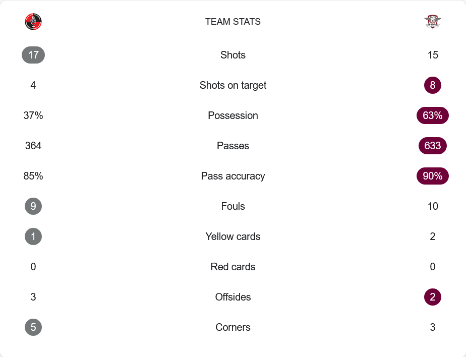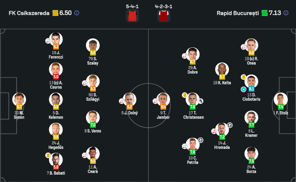 ราปิด บูคาเรสต์ ครองบอลมากถึง 63% เทียบกับ Csíkszereda ที่มีเพียง 37% พวกเขาจ่ายบอลทั้งหมด 633 ครั้งด้วยความแม่นยำถึง 90% ขณะที่เจ้าบ้านจ่ายไป 364 ครั้งแม่นยำ 85% โอกาสยิงของ Csíkszereda มากถึง 17 ครั้งแต่เข้ากรอบเพียง 4 ส่วนทีมเยือนมีแค่ 15 ครั้งแต่เข้ากรอบ 8 ชัดเจนว่าความเด็ดขาดคือปัจจัยสำคัญ นอกจากนี้ เจ้าบ้านได้เตะมุม 5 ครั้ง เทียบกับราปิดที่มีแค่ 3 ครั้ง แต่ทีมเยือนก็เปลี่ยนเป็นประตูได้ดีกว่า