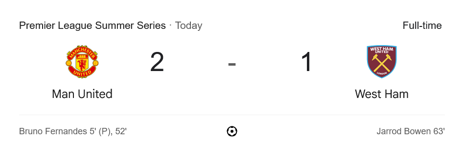 ศึกกระชับมิตรสุดมันในรายการ Premier League Summer Series คืนที่ผ่านมา “ปีศาจแดง” แมนเชสเตอร์ ยูไนเต็ด เปิดเกมเดือดเฉือนเอาชนะ “ขุนค้อน” เวสต์แฮม ยูไนเต็ด ไปได้ 2-1 จากสองประตูสุดคมของกัปตันทีมอย่าง บรูโน่ แฟร์นันเดส โดยเกมนี้แฟนๆ ที่ตาม ผลบอลสด คงได้ลุ้นกันตั้งแต่นาทีแรกจนสิ้นเสียงนกหวีดสุดท้าย