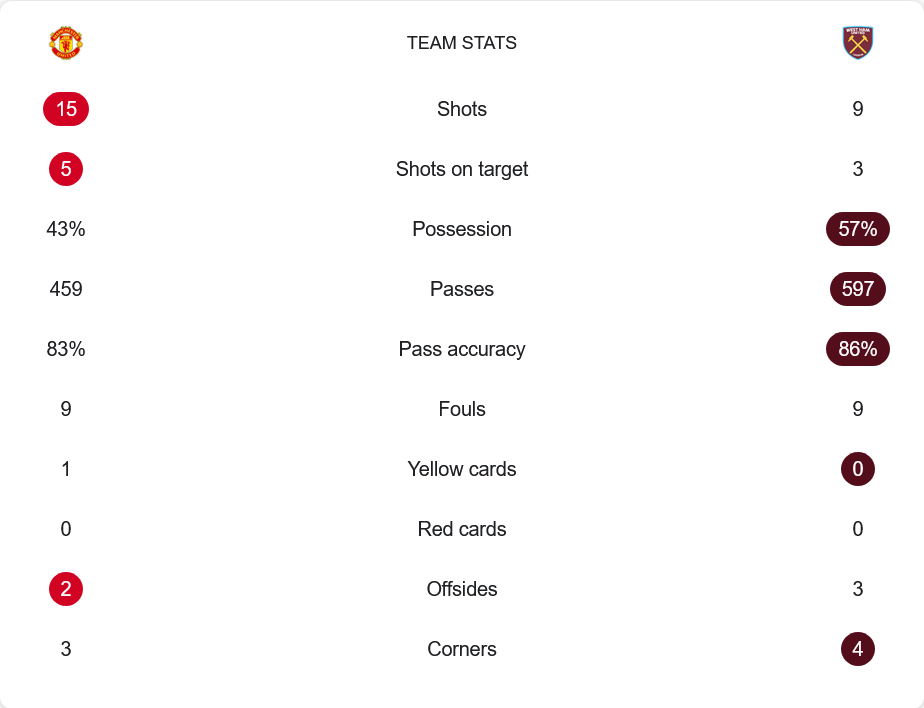 แม้ว่าแมนยูจะเป็นฝ่ายยิงรวมมากกว่าถึง 15 ครั้ง และครองบอลเพียง 43% แต่กลับเป็นฝ่ายเปลี่ยนโอกาสน้อยให้กลายเป็นประตูได้ถึงสองครั้ง ขณะที่เวสต์แฮมครองบอลได้ 57% และผ่านบอลมากถึง 597 ครั้ง แต่ยังขาดความเฉียบขาดในพื้นที่สุดท้าย โดยยิงตรงกรอบได้เพียง 3 ครั้งจากทั้งหมด 9 ครั้งเท่านั้น ทั้งสองทีมมีจำนวนฟาวล์เท่ากันคือ 9 ครั้ง และไม่มีใบแดงในเกมนี้ มีเพียงลีนูร์ โยโร ที่รับใบเหลืองไปหนึ่งใบในครึ่งแรก