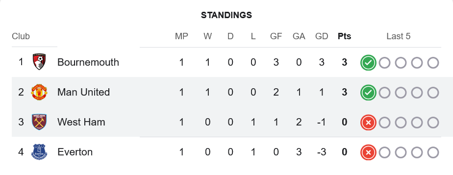 จากผลการแข่งขันล่าสุด แมนเชสเตอร์ ยูไนเต็ด เก็บเพิ่มเป็น 3 แต้มจาก 1 นัดเท่ากับบอร์นมัธ แต่ประตูได้เสียเป็นรองจึงรั้งอันดับ 2 ส่วน เวสต์แฮม ยังไม่มีคะแนน รั้งอันดับ 3 จาก 4 ทีมในกลุ่มนี้ ซึ่งสถานการณ์ยังเปิดกว้างสำหรับเกมถัดไปในการลุ้นเข้ารอบหรือคว้าแชมป์กลุ่ม