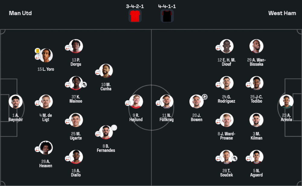 เกมนี้ แมนเชสเตอร์ ยูไนเต็ด มาในแผน 3-4-2-1 ที่เน้นการเพรสซิ่งจากแดนกลาง โดยใช้ อูการ์เต้ และ ไมนู ช่วยตัดเกม พร้อมเปิดโอกาสให้ บรูโน่ และ คุนญ่า ลอยสูงปั้นเกมรุก ส่วน ฮอยลุนด์ ยืนเป็นหน้าเป้าเพื่อพักบอล ซึ่งจังหวะเกมสวนกลับนั้นเร็วและเฉียบคม ทำให้สามารถเจาะแนวรับเวสต์แฮมได้ถึงสองประตู