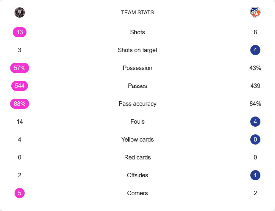 แม้อินเตอร์ ไมอามีจะจบสกอร์ไม่ได้แต่พวกเขาเป็นฝ่ายที่บุกมากกว่าชัดเจนด้วยการยิงถึง 13 ครั้ง เทียบกับซินซินเนติที่ยิง 8 ครั้ง อย่างไรก็ตามทั้งสองทีมมีโอกาสยิงเข้ากรอบพอๆ กัน (3 กับ 4 ครั้งตามลำดับ) ซึ่งแสดงถึงการวางเกมรับและผู้รักษาประตูที่ทำหน้าที่ได้อย่างเหนียวแน่น อินเตอร์มีเปอร์เซ็นต์การครองบอลสูงถึง 57% และจ่ายบอลแม่นยำถึง 88% จากจำนวนการจ่าย 544 ครั้ง ส่วนซินซินเนติก็ไม่น้อยหน้าด้วยความแม่นยำ 84% จากการจ่าย 439 ครั้ง สถิติเหล่านี้ย้ำชัดว่าเกมนี้เป็นการเจอกันระหว่างทีมที่ครองเกมเก่ง กับทีมที่เล่นรับลึกได้อย่างมีวินัย