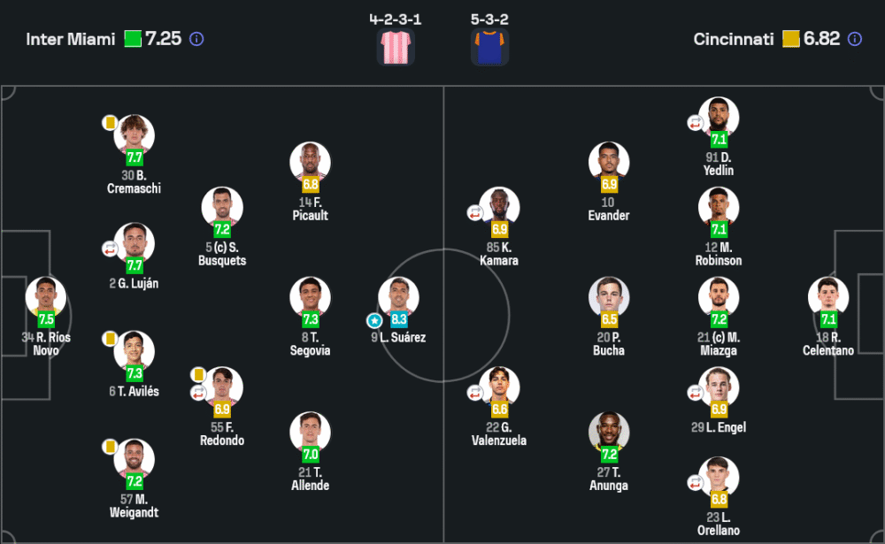 แม้จะไม่มีประตูในนัดนี้แต่ หลุยส์ ซัวเรซ คือความหวังสูงสุดของอินเตอร์ ไมอามีในเกมนี้ เขาขยันเคลื่อนที่ รับบอล ลากลาก และยิงประตูอย่างต่อเนื่อง จบเกมด้วยคะแนนสูงสุด 8.3 เป็นนักเตะที่สร้างความอันตรายได้มากที่สุดของทั้งสองทีม เรียกได้ว่าแบกเกมรุกทั้งระบบไว้คนเดียว