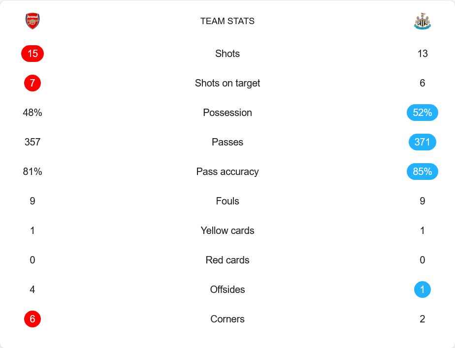 แม้อาร์เซนอลจะครองบอลน้อยกว่า (48%) และผ่านบอลน้อยกว่า (357 ครั้ง) เมื่อเทียบกับ นิวคาสเซิ่ล (52% ครองบอล, ผ่านบอล 371 ครั้ง) แต่ความแม่นยำในการเข้าทำถือว่าดีกว่า โดยยิงรวม 15 ครั้ง เข้ากรอบถึง 7 หน ขณะที่นิวคาสเซิ่ลยิง 13 ครั้ง เข้ากรอบ 6 หน ความแม่นยำในการจ่ายบอลของทีมเยือนสูงกว่าที่ 85% ขณะที่เจ้าถิ่นอยู่ที่ 81% ทั้งสองทีมทำฟาวล์เท่ากันที่ 9 ครั้ง ใบเหลืองฝั่งละ 1 ใบ อาร์เซนอลได้เตะมุมมากถึง 6 ครั้ง ขณะที่นิวคาสเซิ่ลได้เพียง 2
