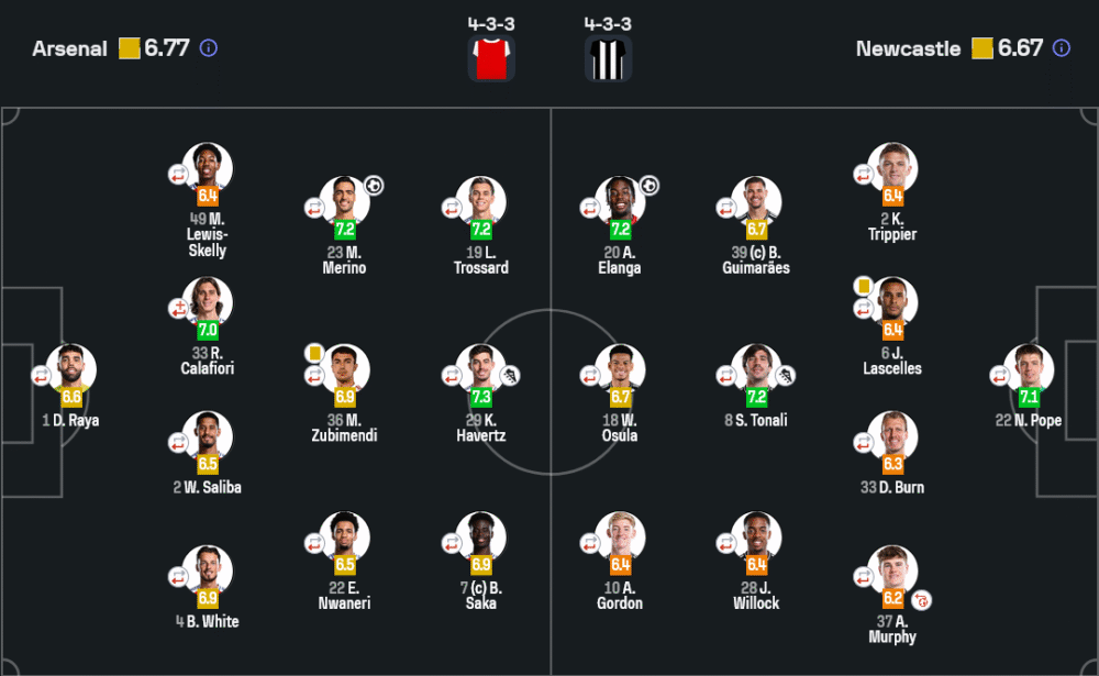 เกมนี้ อาร์เซนอลของ อาร์เตต้า ยังคงยึดแผน 4-3-3 โดยเน้นการขึ้นเกมเร็วจากแดนกลางสู่ริมเส้น ใช้ปีกอย่าง ซาก้า และทรอสซาร์ ทำลายแนวรับนิวคาสเซิ่ลได้ดี โดยเฉพาะในครึ่งแรกที่สามารถเจาะแนวหลังได้หลายจังหวะ ส่วนแผงมิดฟิลด์ที่มี ฮาแวร์ตซ์ และ เมริโน่ ถือว่าทำได้เยี่ยม ทั้งเกมรุกและการเคลื่อนที่กดดันบอลได้ต่อเนื่อง