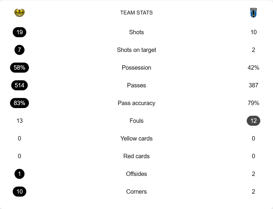 เกมนี้เป็นของมอลล์บี้อย่างแท้จริงเมื่อดูจากตัวเลข ครองบอล 58% ต่อ 42% ของซิริอุส และมีโอกาสยิงมากถึง 19 ครั้ง เข้ากรอบ 7 ครั้ง ขณะที่ซิริอุสได้ยิงเพียง 10 ครั้งและเข้ากรอบเพียง 2 หน นอกจากนี้มอลล์บี้ยังจ่ายบอลสำเร็จมากถึง 514 ครั้ง คิดเป็น ความแม่นยำ 83% เทียบกับ 79% จาก 387 ครั้งของทีมเยือน ทั้งสองทีมไม่มีใบเหลืองหรือใบแดง แต่เจ้าบ้านได้เตะมุมถึง 10 ครั้ง ส่วนซิริอุสแค่ 2 ครั้ง
