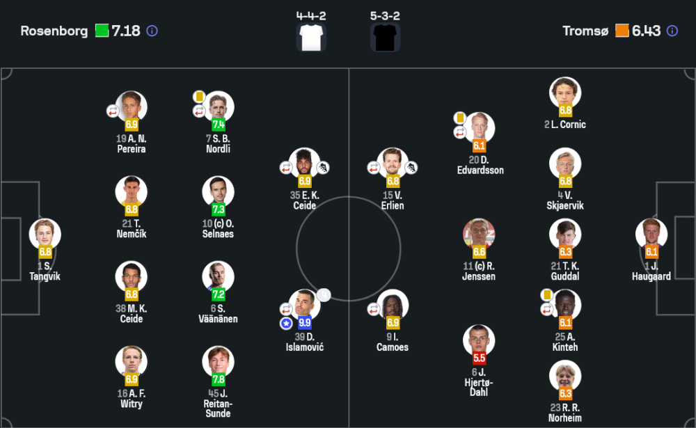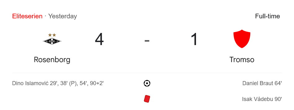 แม้ทรอมโซ่พยายามฮึดแต่ต้องมาเสียเปรียบตัวผู้เล่นเมื่อ อีซัค วาเดบู โดนใบแดงไล่ออกในนาที 90 จากการฟาวล์รุนแรง และเป็นอิสลาโมวิชอีกครั้งที่สังหารประตูปิดกล่องในนาที 90+2 จบเกม โรเซนบอร์ก ไล่ยำ ทรอมโซ่ ไปอย่างขาดลอย 4-1