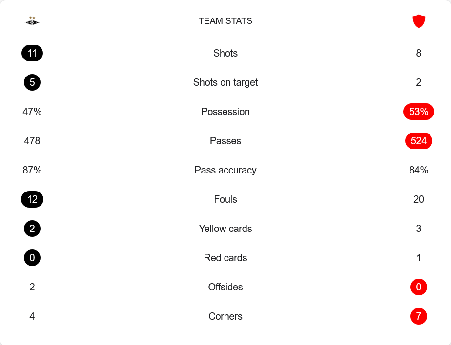 แม้โรเซนบอร์กจะครองบอลน้อยกว่าด้วยสัดส่วนเพียง 47% แต่ความเฉียบคมในพื้นที่สุดท้ายทำให้พวกเขาเปลี่ยนโอกาสเป็นประตูได้ดีกว่า โดยมีโอกาสยิงทั้งหมด 11 ครั้ง เข้ากรอบ 5 ครั้ง ส่วนทรอมโซ่มีโอกาสเพียง 8 ครั้ง และยิงเข้ากรอบ 2 หน นอกจากนี้ โรเซนบอร์กยังจ่ายบอลแม่นยำถึง 87% จากทั้งหมด 478 ครั้ง ส่วนทรอมโซ่แม้จะครองบอลมากกว่าแต่จ่ายบอลแม่นยำเพียง 84% จาก 524 ครั้ง พวกเขายังทำฟาวล์มากถึง 20 ครั้ง และเสียถึง 3 ใบเหลือง 1 ใบแดง ขณะที่เจ้าถิ่นเสียแค่ 2 ใบเหลือง ไม่มีใบแดง