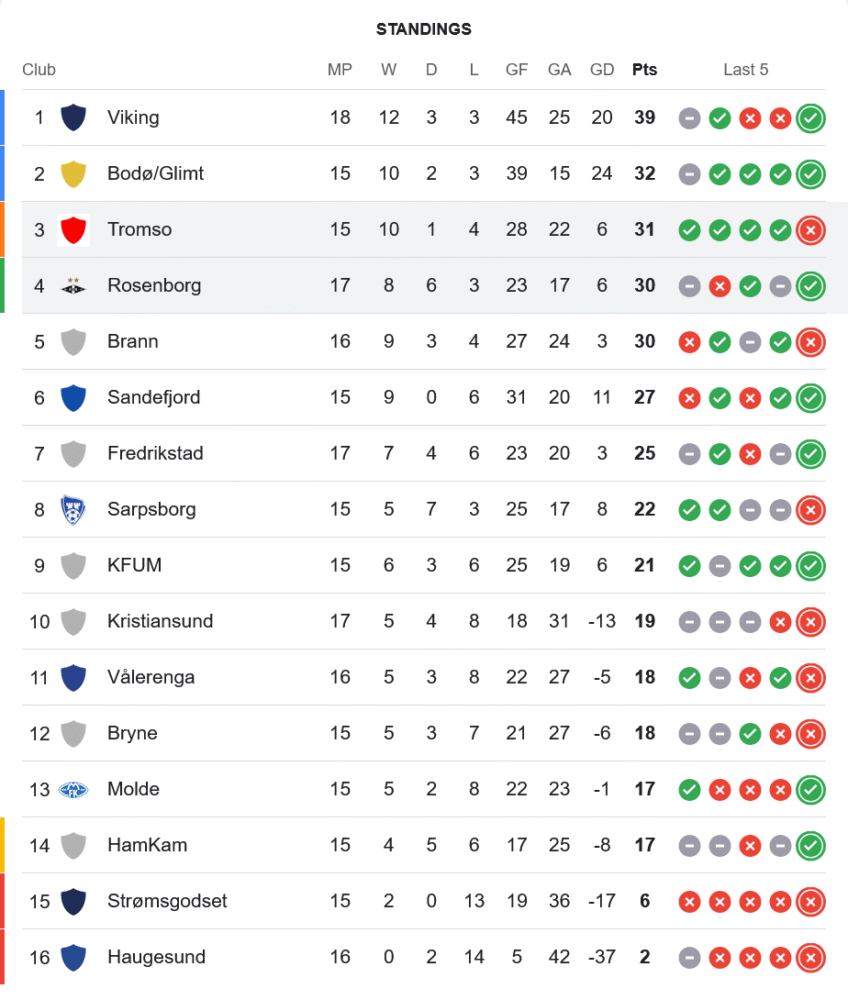 ชัยชนะเกมนี้ส่งผลให้ โรเซนบอร์ก ขยับขึ้นมาอยู่อันดับ 4 ของตาราง มี 30 แต้มจาก 17 นัด ไล่จี้ ทรอมโซ่ ที่อยู่อันดับ 3 มี 31 แต้มจาก 15 นัดแบบกระชั้นชิด ขณะที่ ทรอมโซ่ เสียสถิติชนะรวด 5 นัดหลังสุดและต้องกลับไปแก้เกมก่อนที่อันดับจะหลุดจากกลุ่มลุ้นแชมป์ในอีกไม่กี่สัปดาห์