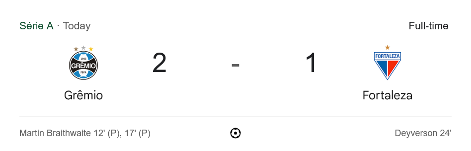 แม้จะครองบอลมากกว่า แต่ทีมเยือนไม่สามารถเจาะแนวรับของเกรมิโอ้ได้จนจบเกม และต้องยอมรับความพ่ายแพ้ไปด้วยสกอร์ 2-1 ส่งผลให้สถานการณ์ของทั้งสองทีมในตารางคะแนนเปลี่ยนไปอย่างมีนัยสำคัญ พร้อมทิ้งคำถามเรื่องจุดโทษในเกมนี้ถึง 3 ครั้งใน 24 นาทีแรกของเกม