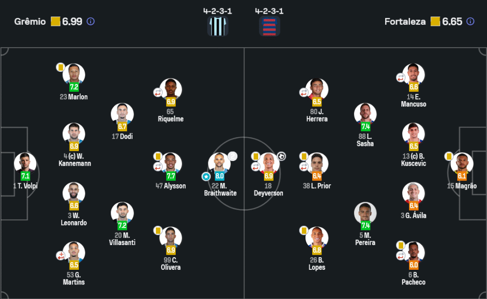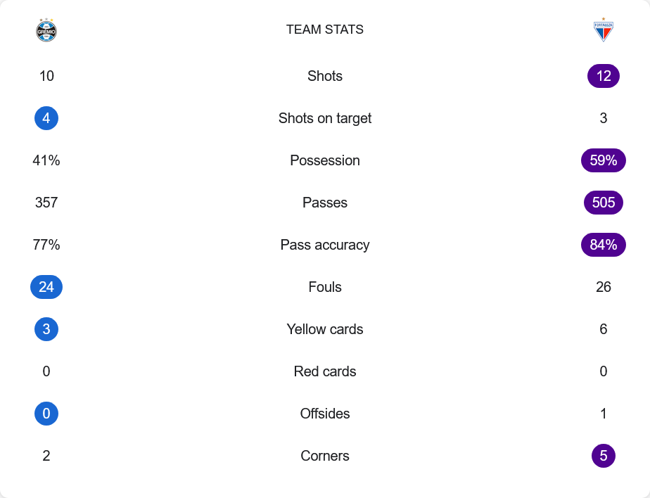 แม้เกรมิโอ้จะเป็นฝ่ายชนะ แต่ทีมเยือนฟอร์ตาเลซ่าครองบอลได้ถึง 59% และจ่ายบอลมากถึง 505 ครั้ง (เทียบกับเจ้าบ้าน 357 ครั้ง) พร้อมอัตราความแม่นยำในการส่งบอลที่เหนือกว่าชัดเจนถึง 84% ขณะที่เกรมิโอ้อยู่ที่ 77% ส่วนโอกาสยิงนั้น ฟอร์ตาเลซ่ายิงมากกว่า (12 ครั้ง) แต่เข้ากรอบน้อยกว่าเจ้าถิ่นที่มี 4 จาก 10 ครั้ง ด้านใบเหลือง ฟอร์ตาเลซ่าถูกแจกถึง 6 ใบ ขณะที่เกรมิโอ้ได้ 3 ใบ รวมถึงมีการฟาวล์รวมกันถึง 50 ครั้ง บ่งบอกถึงความเข้มข้นของเกมนี้ได้อย่างดี