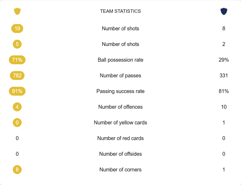 โบโด กลิมท์ครองบอลถึง 71% ตลอดทั้งเกม โดยจ่ายบอลได้ถึง 782 ครั้ง และมีอัตราการจ่ายสำเร็จ 91% พวกเขาสร้างโอกาสยิงถึง 19 ครั้ง เข้ากรอบ 5 หน และได้เตะมุมมากถึง 8 ครั้ง ขณะที่สตรอมก็อดเซ็ทครองบอลเพียง 29% จ่ายบอล 331 ครั้ง ความแม่นยำเทียบเท่า (81%) แต่สร้างโอกาสได้น้อยมาก ยิงเพียง 8 ครั้ง เข้ากรอบแค่ 2 หน และได้เตะมุมแค่ครั้งเดียว เกมนี้สตรอมก็อดเซ็ทยังโดนใบเหลือง 1 ใบจากอัมโปโฟอีกด้วย