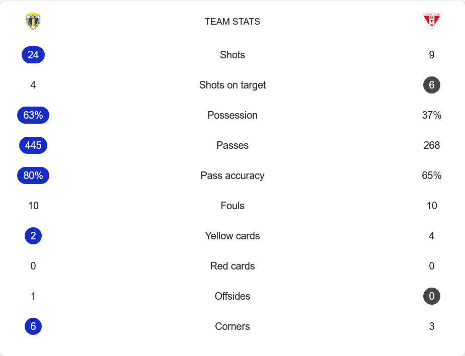 แม้ยูทีเอ อารัดจะเป็นฝ่ายเก็บชัย แต่ภาพรวมทางสถิติ ปิโตรลูลถือว่าครองเกมได้หมด ทั้งการครองบอล 63% การผ่านบอล 445 ครั้งด้วยความแม่นยำ 80% และโอกาสยิงมากถึง 24 ครั้ง แต่แค่ 4 ครั้งเท่านั้นที่เข้ากรอบ ต่างจากทีมเยือนที่แม้จะครองบอลเพียง 37% และจ่ายบอลแค่ 268 ครั้ง แต่มีโอกาสยิงเพียง 9 ครั้ง กลับเข้ากรอบถึง 6 และเปลี่ยนเป็น 2 ประตู