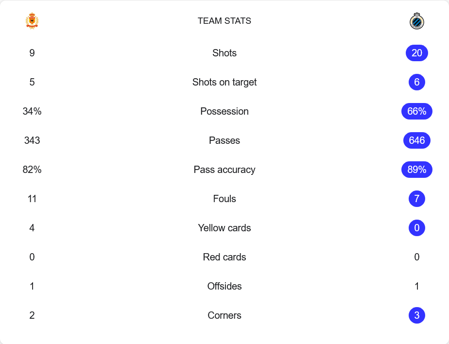 แม้รูปเกมจะดูสูสี แต่เมื่อดูตัวเลขแล้ว คลับ บรูซเหนือกว่าชัดเจนด้วยการครองบอลถึง 66% และจ่ายบอลมากถึง 646 ครั้ง เทียบกับเมเชเลนที่มีแค่ 343 ครั้งเท่านั้น แถมยังมีโอกาสยิงถึง 20 ครั้ง (เข้ากรอบ 6) ขณะที่เจ้าถิ่นยิงเพียง 9 ครั้ง (เข้ากรอบ 5) แต่เมเชเลนกลับเฉียบคมและทำได้ถึง 2 ประตู เกมนี้ยังเห็นความแม่นยำในการจ่ายบอลของทีมเยือนที่สูงถึง 89% เทียบกับ 82% ของเจ้าบ้าน อย่างไรก็ตาม ความแน่นอนในแดนหน้าของเมเชเลนกลายเป็นตัวแปรสำคัญในการเก็บสามแต้ม